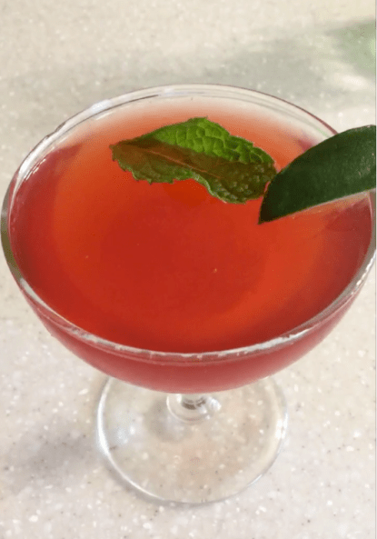 Pour into a coup and tip with sparkling lemon water. Garnish with mint and fresh lime.